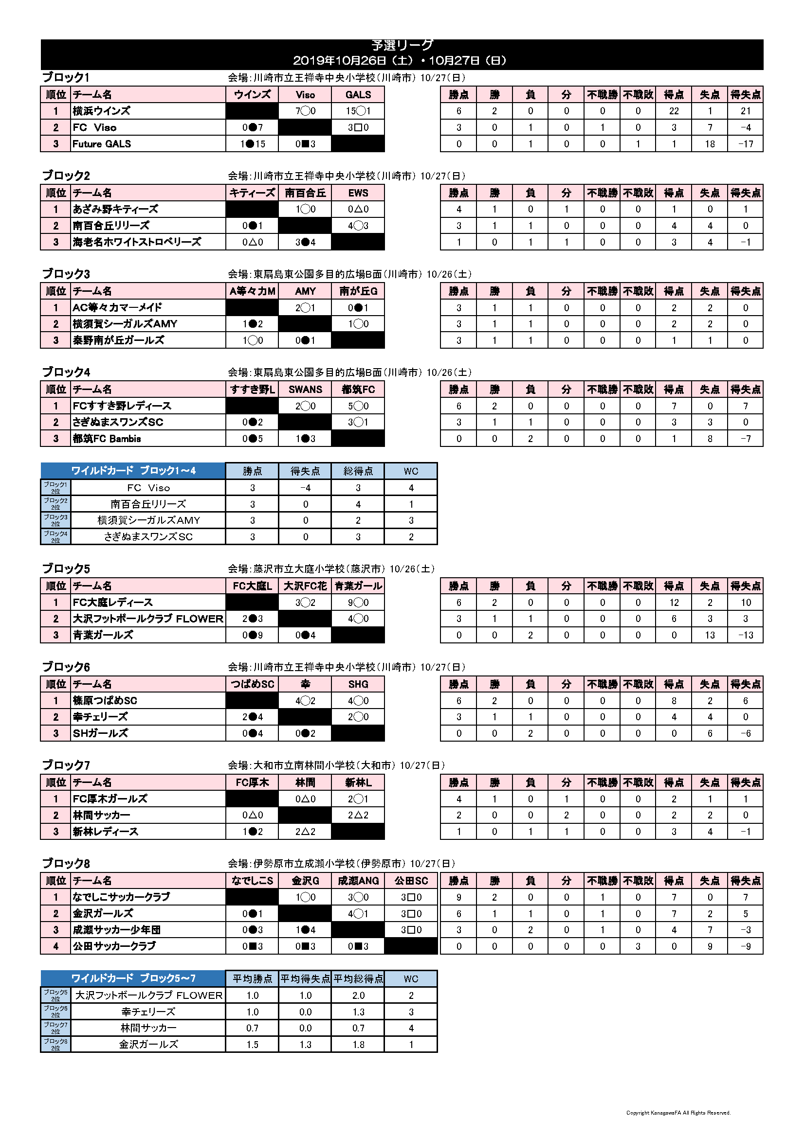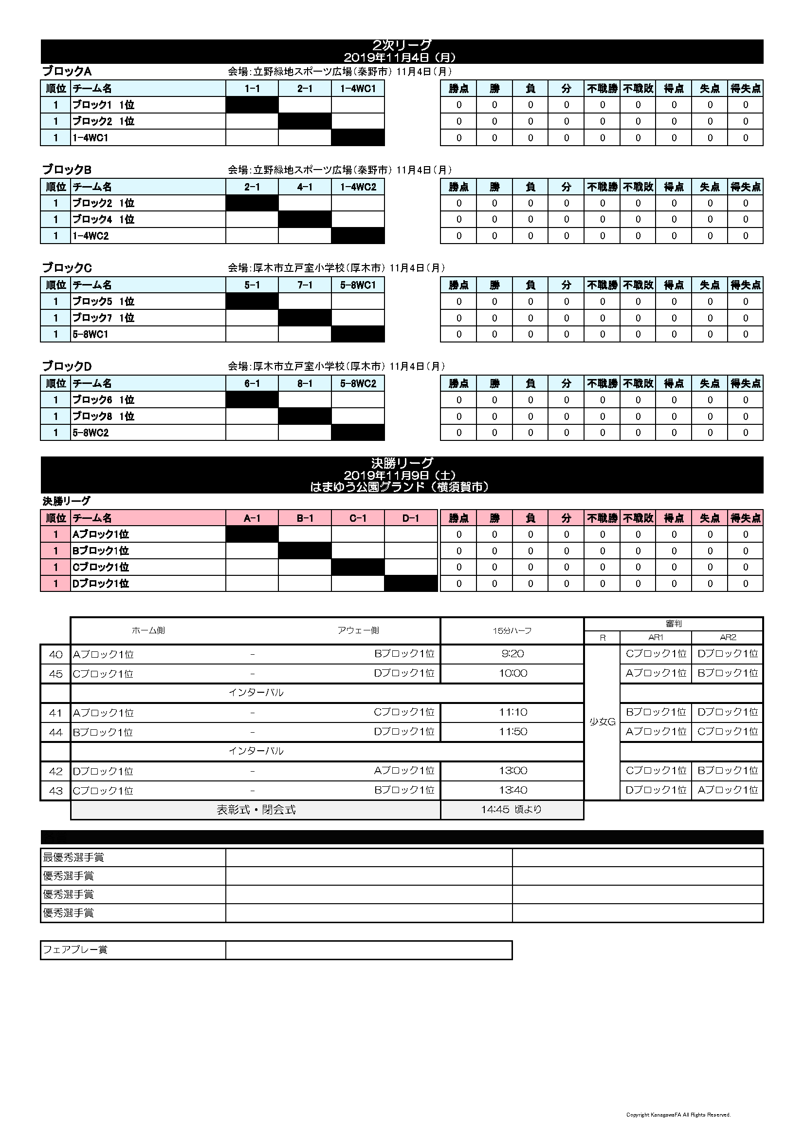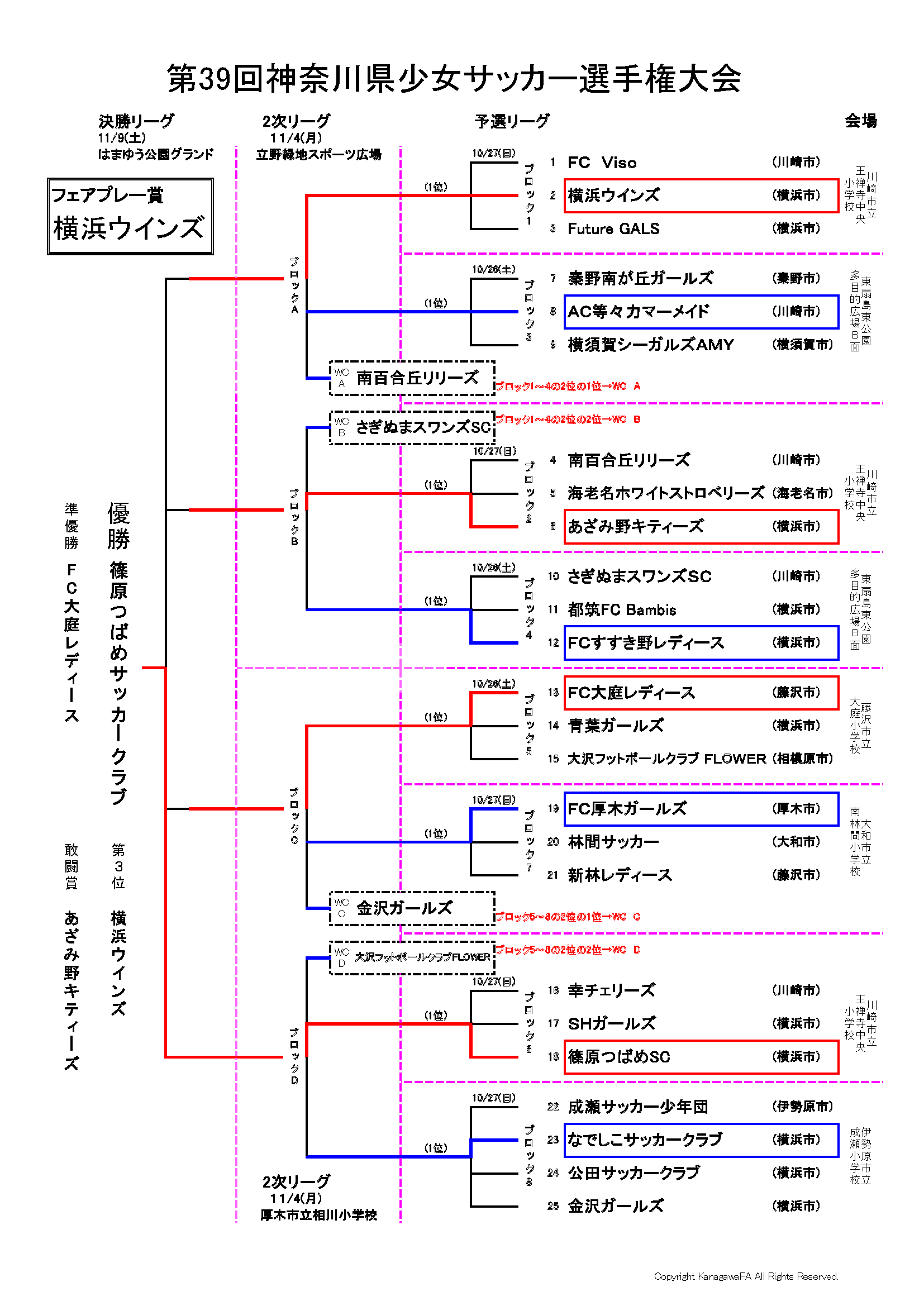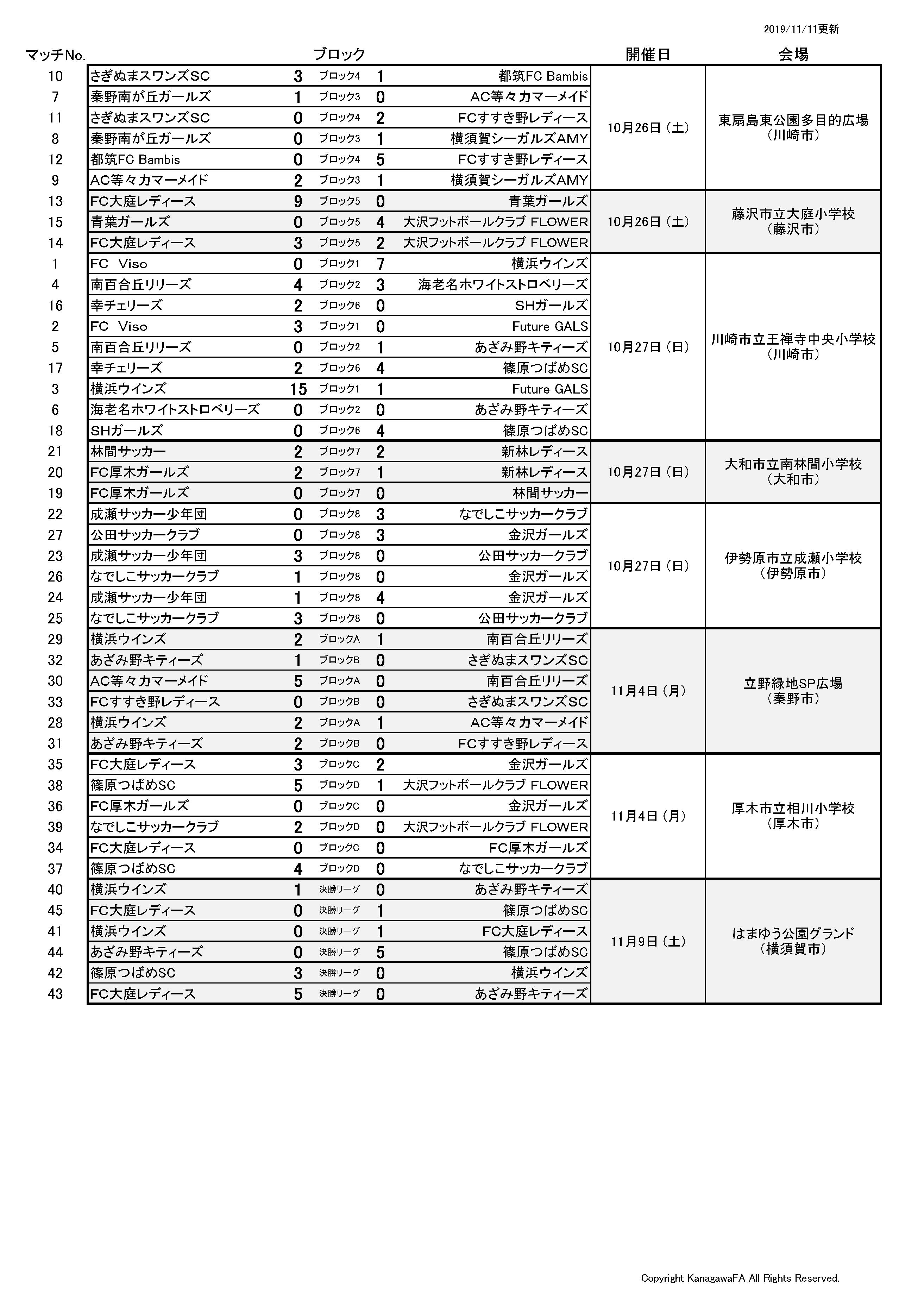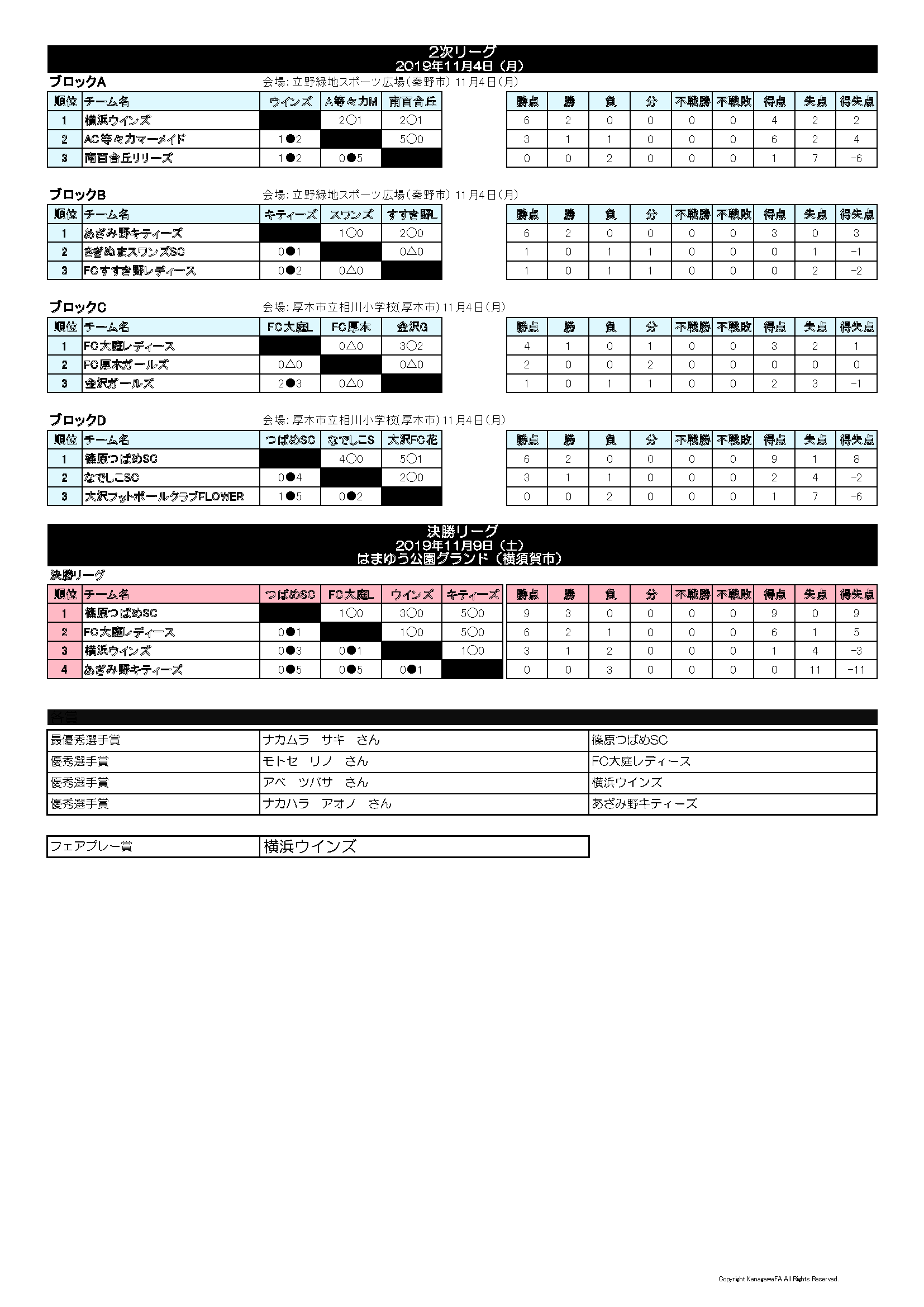 | 2次リーグ | 11/4に2次リーグが行われました。 決勝リーグ進出は以下の4チーム 横浜ウインズ(横浜市) あざみ野キティーズ(横浜市) FC大庭レディース(藤沢市) 篠原つばめSC(横浜市) 11/9(土)「はまゆう公園グラウンド」で実施します |