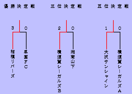 | 早園FC | 湘南山下 | シーガルズA | 勝点 | 勝 | 分 | 負 | 得点 | 失点 | 得失点 | 順位 | |