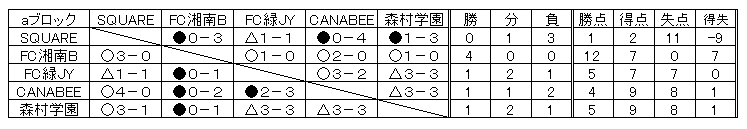 | Aブロック | SQUARE | FC湘南JYブルー | FC緑JY | CANABEE藤沢 | 森村学園 | |||||