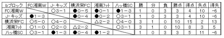 | Bブロック | FC湘南JYホワイト | ジェイ・キッズSC | 横浜栄FC | 湘南フットサルクラブ | 八ツ橋SC | |||||
