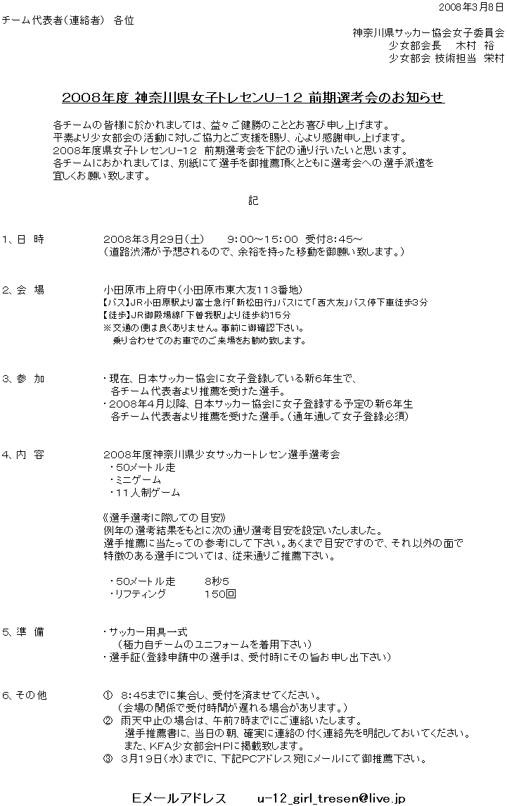 2008年度 神奈川県女子トレセンU-12 前期選考会のお知らせ