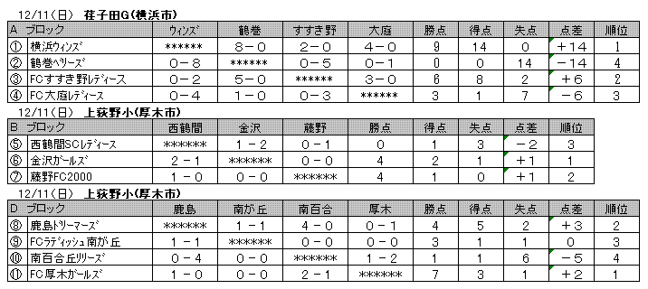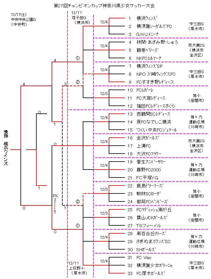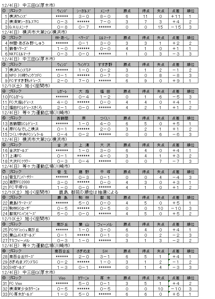 第27回チャンピオンカップ神奈川県少女サッカー大会 期日:2011年12/3(土)〜12/18(日) 結果印刷用 参加申込み: 申込書提出期日:2011年11月9日(水)Emailで申込書提出 参加料振込み:2011年11月8日(火)までチーム名振込み 大会参加振込確認書に領収書を貼り県協会にFAX(0466−46−5696)すること。 抽選会: 日時:2010年11月13日(日) 19:00から 抽選結果速報 会場:神奈川県民サポートセンター 305号室 大会要項 (PDF147kb) 申込書 (Word 48) 確認書 (Word 28) お知らせ 提供会場が少なく、大会要項を見直しましが、手違いで印刷配布のプログラムに反映できませんでした。 本ページ掲載の大会要項に反映しましたのでご確認ください。変更箇所は下記2点です。 13.競技方法 @ 予選リーグ、2次リーグ、決勝トーナメント方式とする。 2次リーグ4チームリーグ2位のトーナメント進出はプレーオフ方式とする。 14.競技規則 @ 競技時間は30分(15-5-15)とする(予選、2次、フレーオフ)。 決勝トーナメントは40分(20-5-20)とする。