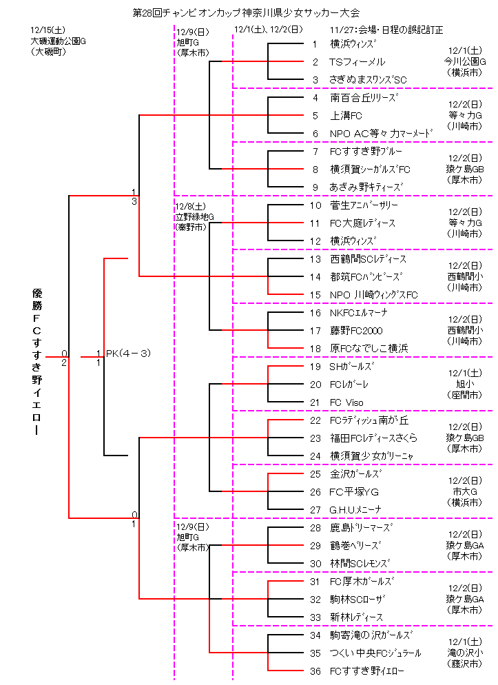 第28回チャンピオンカップ神奈川県少女サッカー大会結果 期日:2012年12/1(土)〜12/15(土) 印刷用PDF 参加申込み: 申込書提出期日:2012年11月7日(水)Emailで申込書提出 速報版 参加料振込み:2012年11月6日(火)までチーム名振込み 大会参加振込確認書に領収書を貼り県協会にFAX(0466−46−5696)すること。 抽選会: 日時:2012年11月10日(土) 19:40から 会場:大和市生涯学習センター 303会議室 大会要項 (PDF147kb) 申込書 (Word 48) 確認書 (Word 28) |