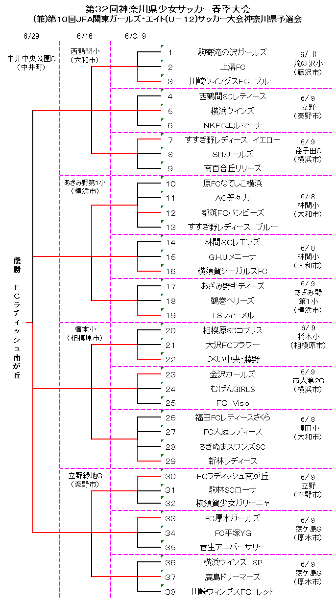 印刷用PDF ( 兼)第11回JFA関東ガールズ・エイト(U-12)サッカー大会神奈川県予選会 参加申し込 参加料振込み後 5月17日(火)まで 抽 選 会 5月12日(土)19:00から 抽選結果速報版 於 神奈川県県民活動サポートセンター305会議室(横浜駅下車徒歩5分) 大会日程 6月8日(土)、9日(日)、15日(土)、16日(日)、29(土)、30日(日) 注)この大会は、JFAの意向もあり、選手の登録種別にこだわらず参加可となっています。 参加の資格は要項をご覧下さい。 至急追加留意事項 大会運営に関し問合せがあり、6/8(木)回答の内容にご留意ください。 参考資料:開催 要項案(PDF140kb)、参加申込書(Word43kb)、振込み確認書(Word29kb)、JFA8人制 規則(JFAページへ) |