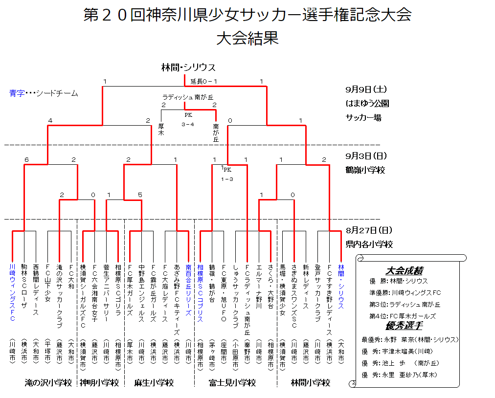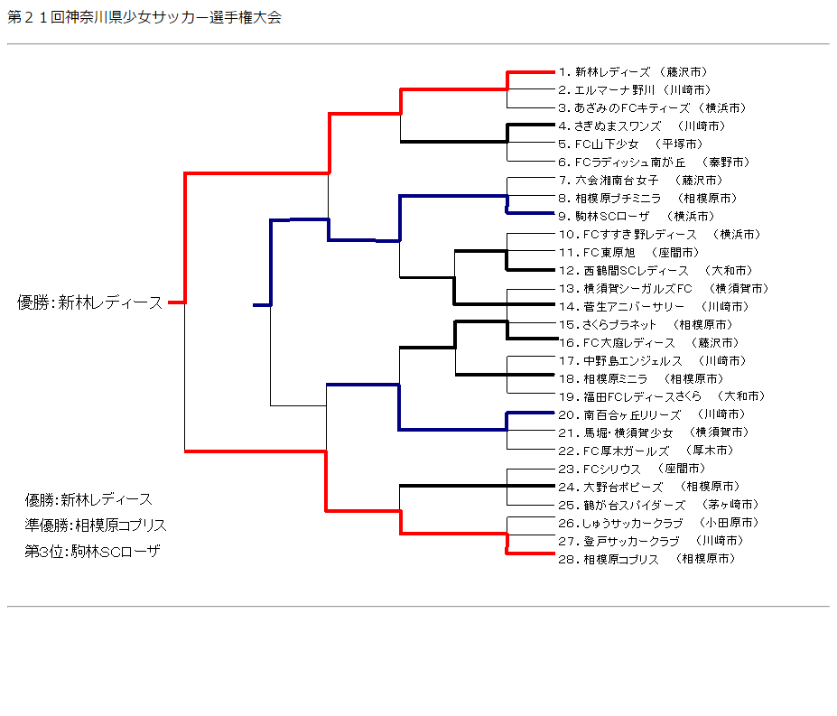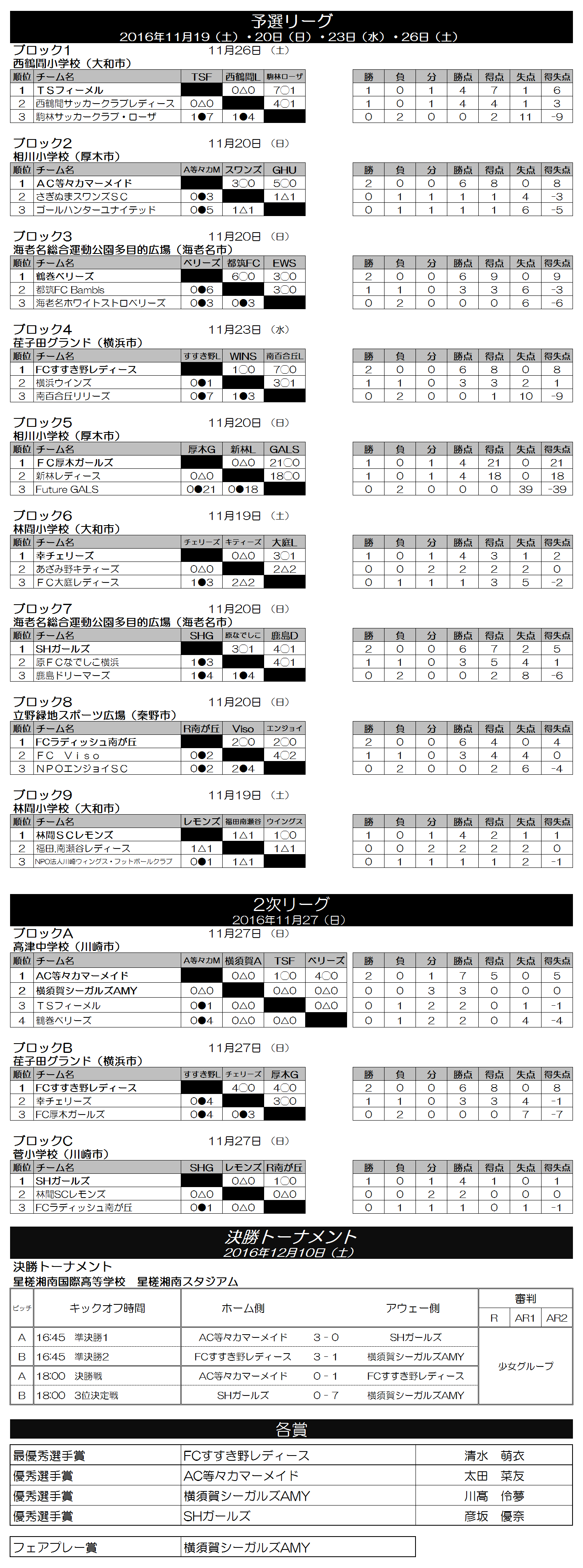 | 決勝リーグ | 11/9に決勝リーグが行われました 優勝 篠原つばめSC 準優勝 FC大庭レディース 3位 横浜ウインズ 敢闘賞 あざみ野キティーズ フェアプレー賞 横浜ウインズ |