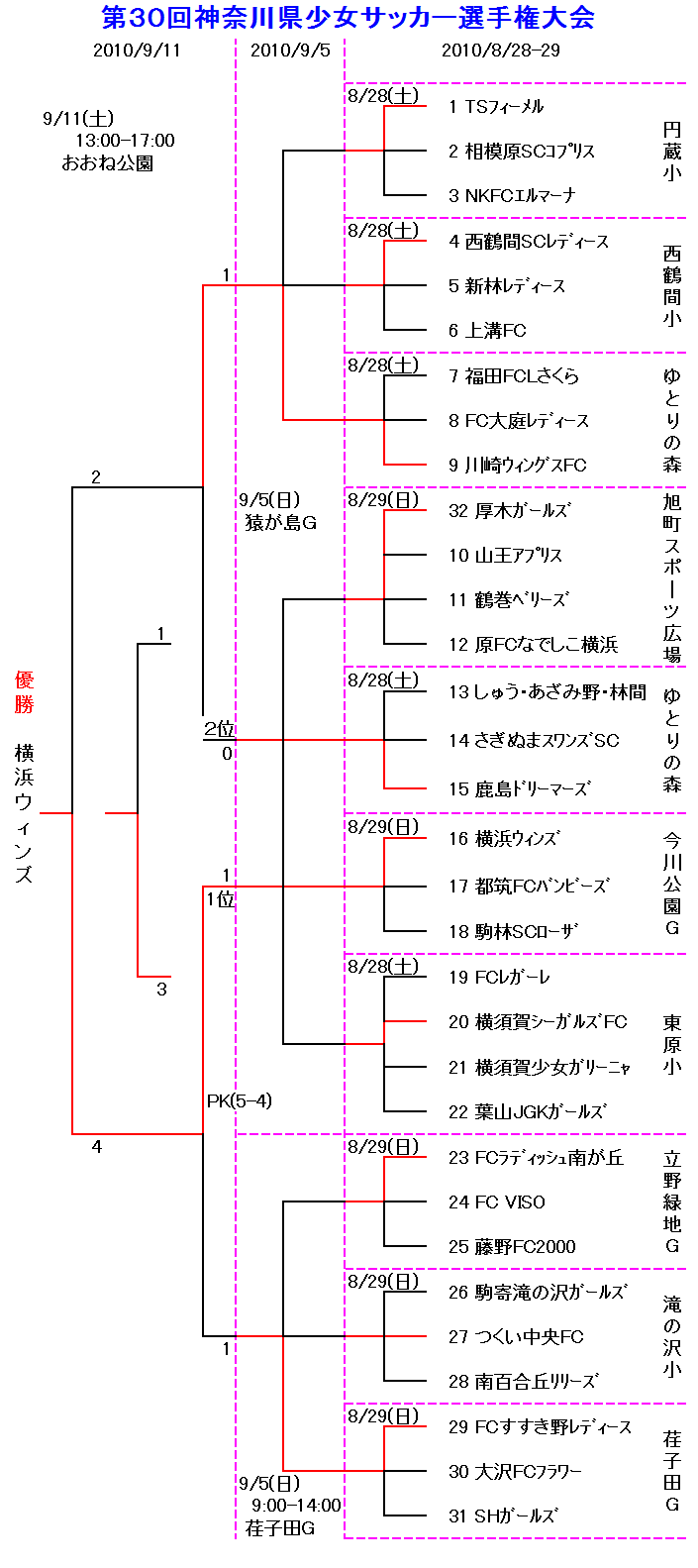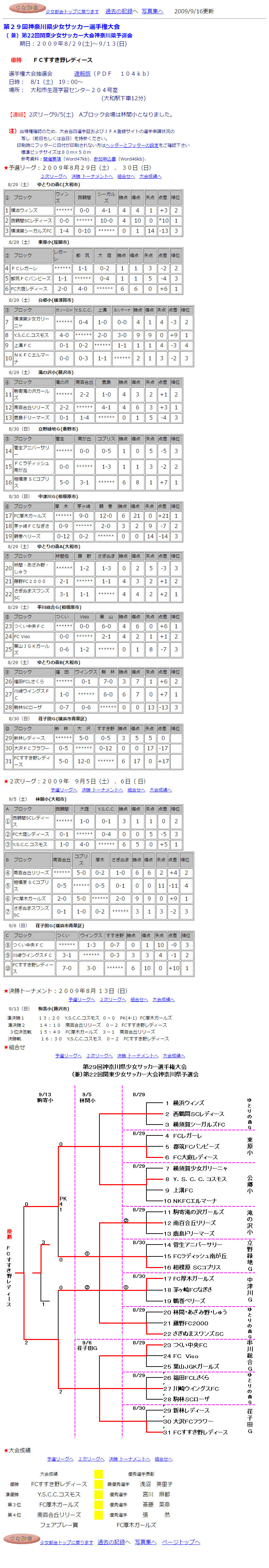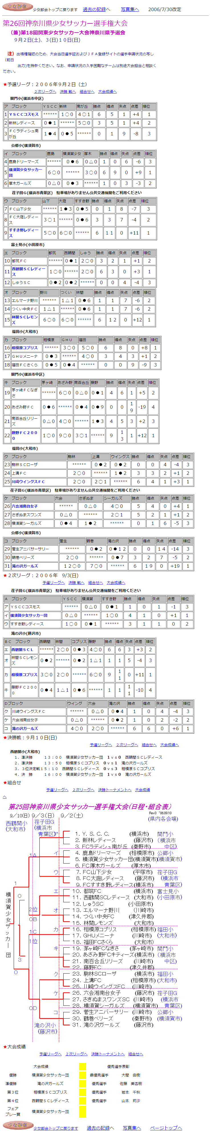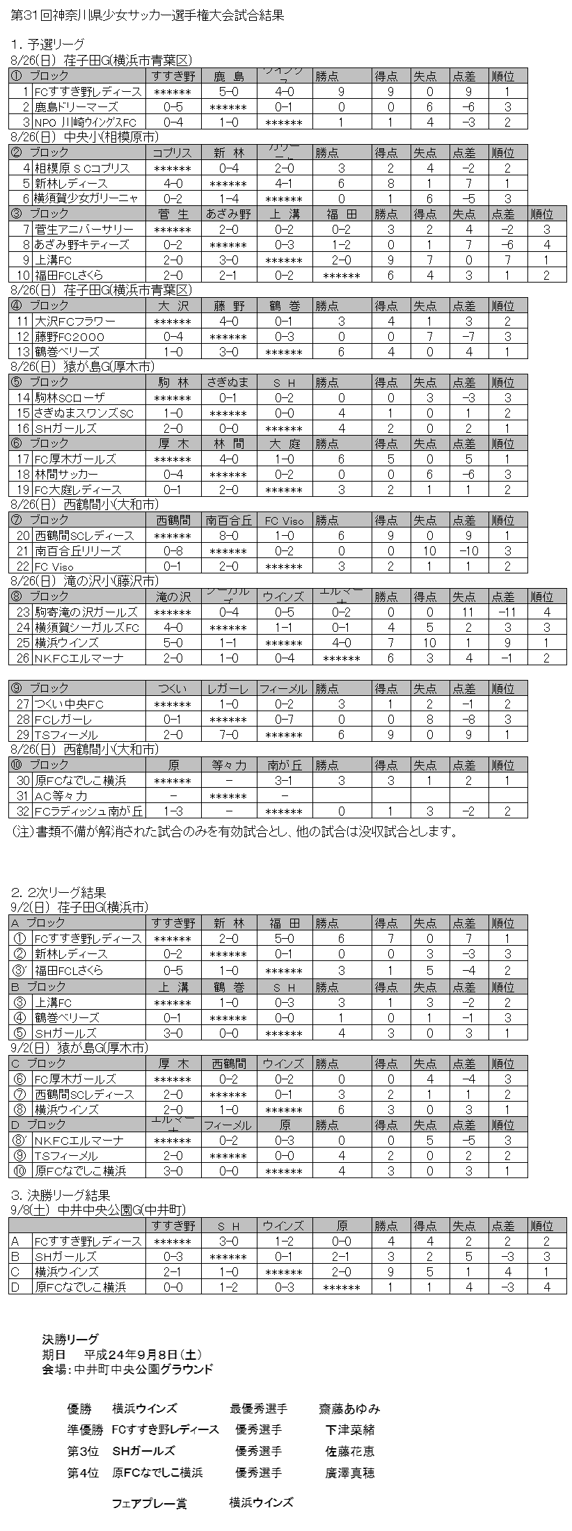 | 2次リーグ | 11/4に2次リーグが行われました。 決勝リーグ進出は以下の4チーム 横浜ウインズ(横浜市) あざみ野キティーズ(横浜市) FC大庭レディース(藤沢市) 篠原つばめSC(横浜市) 11/9(土)「はまゆう公園グラウンド」で実施します |