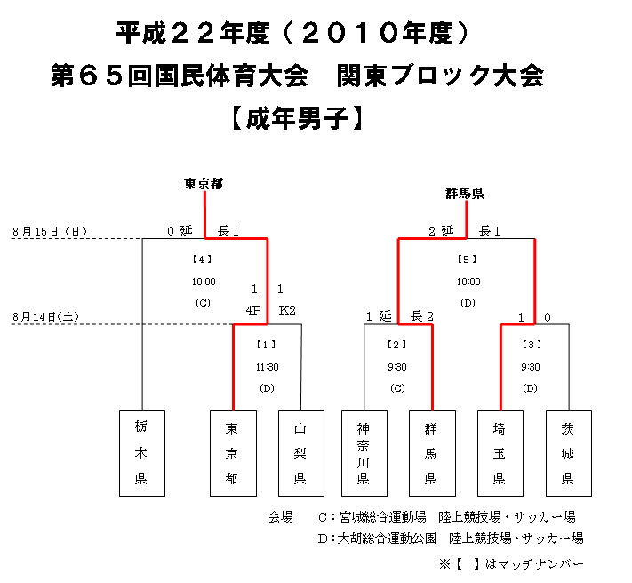 | M−5 | 8月15日 | 10:00 | 大胡総合運動公園陸上競技場・サッカー場 | 群馬県 | 2 | 0 | 前半 | 0 | 1 | 埼玉県 |