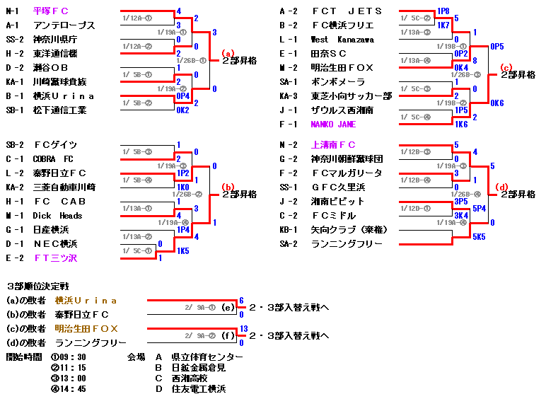 ▼2部・3部入替え戦出場チーム決定。横浜Urina・明治生田FOX (2/9) ▼2部昇格チーム4チーム決定。平塚FC・FT三ツ沢・NANKO JANE・上溝南FC (1/26) ▼2003年1月5日から3月23日 (予定)まで、実施されます。 トーナメント表PDFファイル Download ▼この大会は、下記の大会を兼ねています。 >> 2部昇格トーナメント(1次トーナメントの勝ち上り4チームが自動昇格、及び2チームの入替え戦があります。) >> 神奈川県サッカー選手権大会社会人代表決定戦(上位24チームに出場資格が与えられます。) >> 第39回全国社会人サッカー選手権県代表決定戦(上位1チームに関東大会出場資格が与えられます。) ▼日程等変更する場合がありますので、社会人委員会よりチーム宛に通知したもので最終確認願います。 |