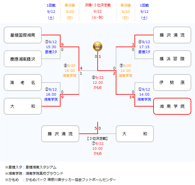 | 2 | 2015/9/12 (土) | 16:00 | 湘南学院高 | 大和高校 | 9 |
